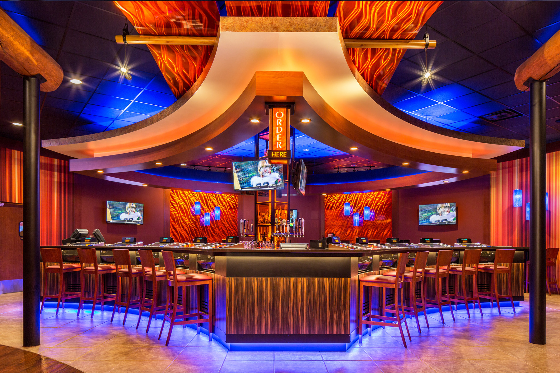 * Konsentrasi pada permainan – bukan pada laga sepak bola yang diperlihatkan di monitor TV besar pada dinding.